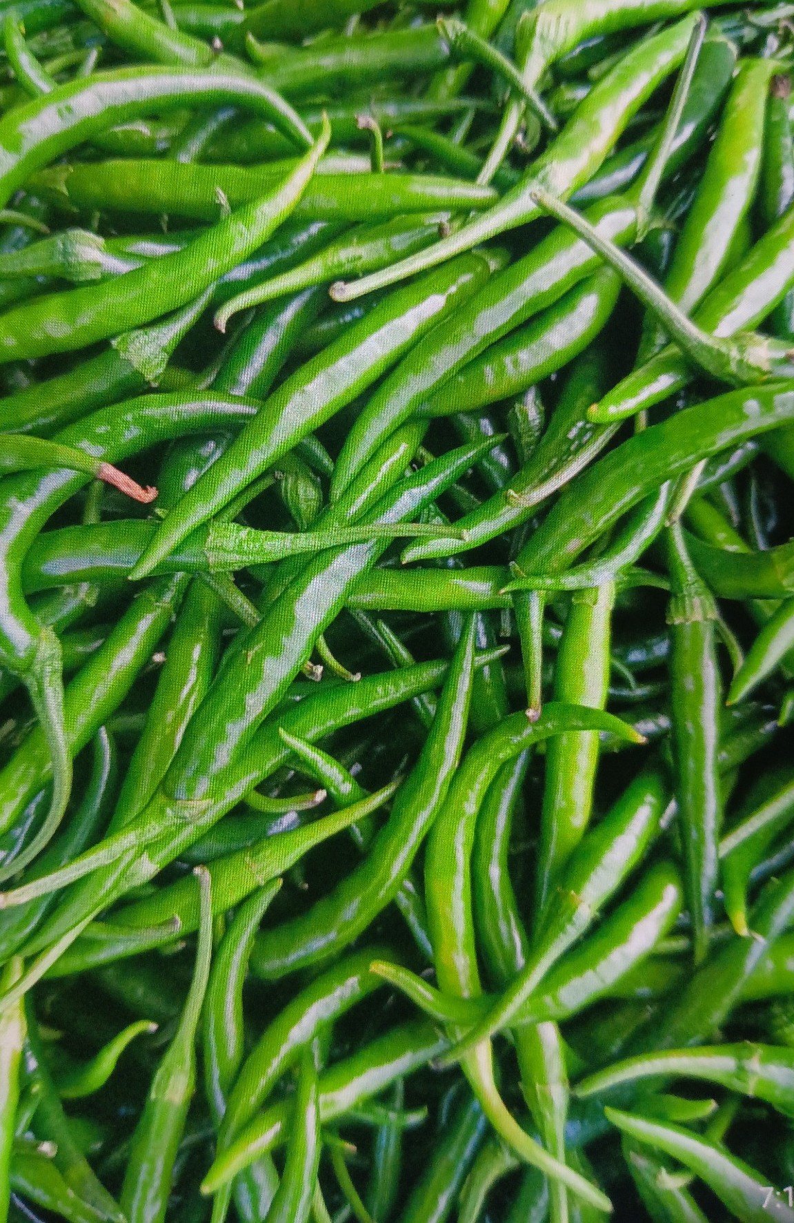 Fresh green chillies — bright, glossy, and full of aromatic heat.